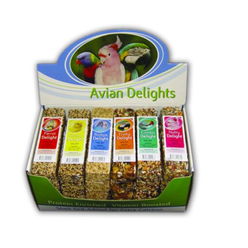 Passwell Avian Delight Parrot Bar 75g. Avian Delight treat bar for small to medium parrots including cockatiels, lovebirds, neophemas, bourkes, red-rumps, rosellas, ringnecks & conures. Key Features: Seed treat enriched with protein & vitamins. Shell grit for added calcium. Edible gelatine binder (not glue).